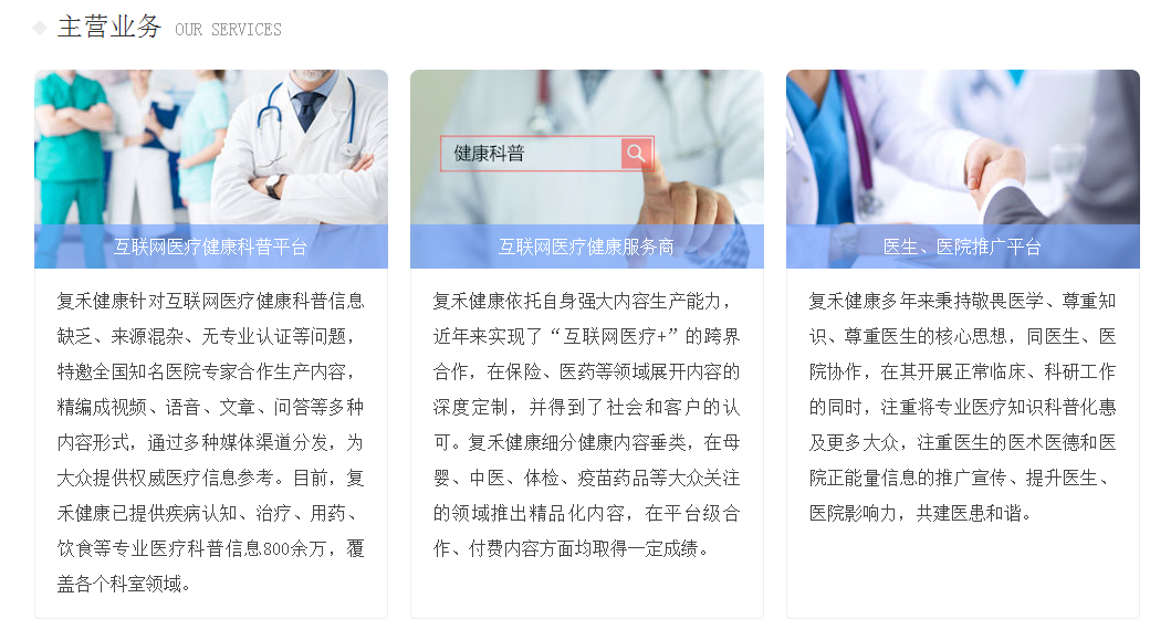 复禾健康对健康内容产业进行全面升级,以搜索引擎、新媒体、视频媒体平台为主要投放渠道,结合互联网大数据,深度挖掘用户健康需求,形成以患者为导向,正规医院、知名医生和专家为内容生产主干的产业模式,有效解决了用户医学知识普及,求医难、医院看病难、医生出诊难等多方面问题。