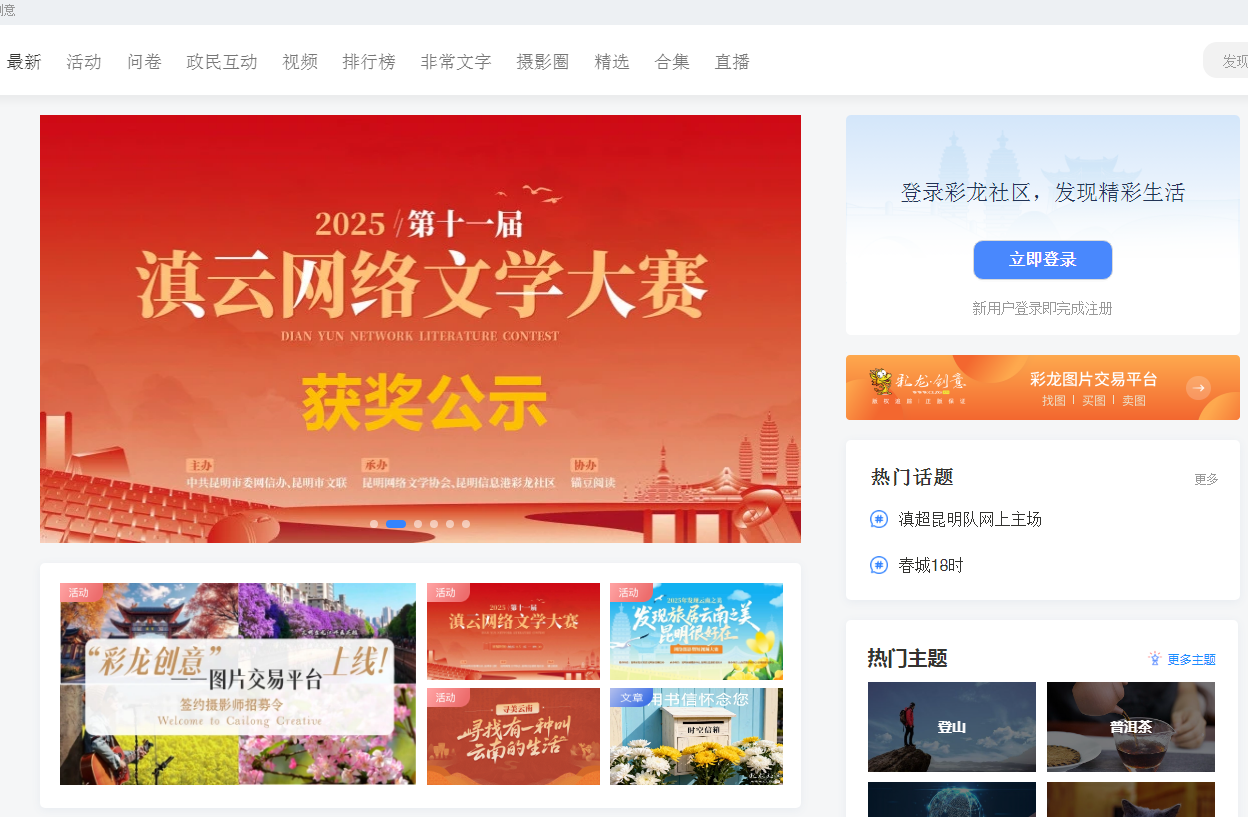 彩龙社区是目前云南省唯一在运营的具有合法资质的新型互动社区。“彩”意指云南,云南有彩云之南、七彩云南之称;“龙”意指昆明,是云南的省会、经济社会的龙头、排头兵。彩龙社区以“最云南 最生活”为定位,为用户提供便捷、智能的互动平台,内容来自用户创作,是昆滇本土生活社交服务门户、政民互动平台和网络文化园地。彩龙社区(clzg.cn)是昆明本地的一个网络社区平台,早期由昆明日报社参与建设,定位为市民互动、UGC(用户生成内容)和部分官方内容分发渠道。曾作为《昆明日报》电子报的阅读入口,提供PDF版或网页版报纸。