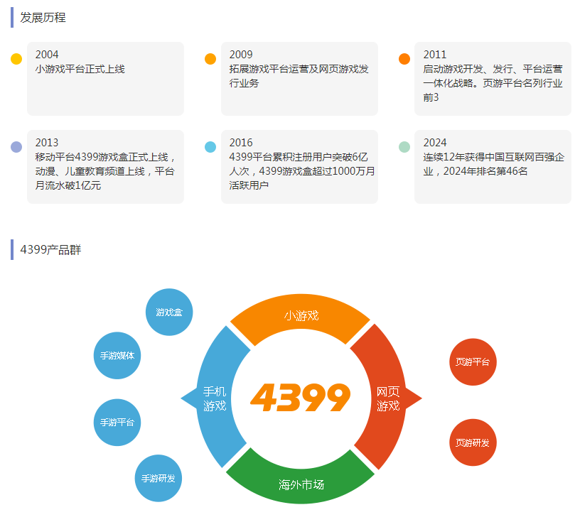 四三九九网络股份有限公司创立于2002年,总部位于厦门,在广州、北京、韩国等地设有分支机构。4399是国内领先的互联网游戏开发商、游戏发行商及平台运营商,现已发展成为集网页游戏、移动游戏开发与发行以及游戏平台运营于一体的综合型互联网游戏公司。
